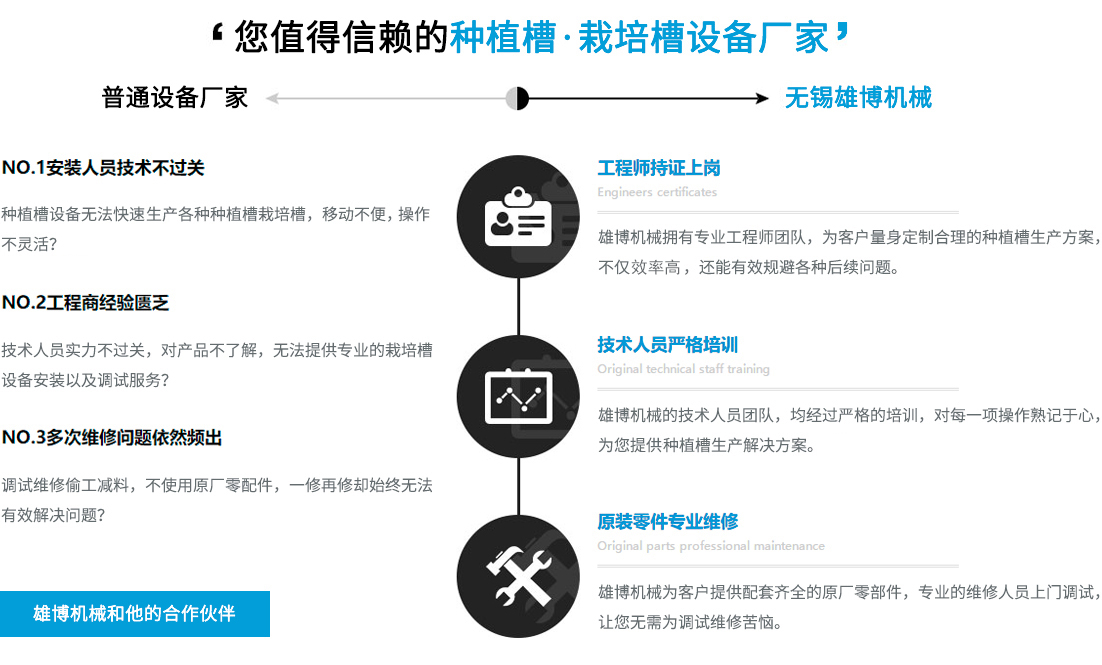 您在選擇雄博產品的同時,也選擇無微不至的終身服務。可根據(jù)不同客戶實際需求進行種植槽設備,栽培槽設備等的特殊工藝設計制造專業(yè)一對一售前/售后/技術咨詢指導,享受更貼心/放心的設備使用體驗。